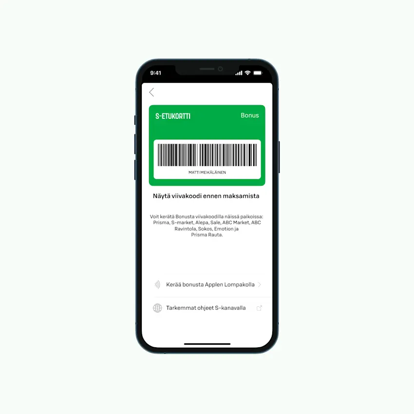 Voit käyttää S-Etukorttia puhelimellasi kolmella tavalla: Applen Lompakossa (iPhone), NFC-lähiluvulla (Android) tai viivakoodilla S-mobiilissa. Kaikilla tavoilla keräät Bonusta ja saat samat asiakasomistajaedut kuin fyysisellä kortilla.
